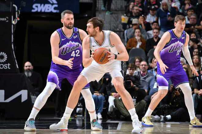 次节比赛,文班亚马暴扣扩大10分优势,爵士内外开花一波15-2攻势反超3分,文班亚马再度三分命中引领一波8-0攻势夺回5分优势。爵士冲击内线追分,文班亚马与福克斯内外开花得分,引领马刺逐步扩大59-51领先优势,爵士一波6-2攻势追分,马刺单节27-31被追回4分,上半场结束马刺61-57领先爵士。前两节比赛,马刺三分24中9,文班亚马12中7(其中三分9中5与罚球2中2)得到21+7与福克斯11分4助攻3抢断;爵士三分20中7,乔治15分4助攻。
