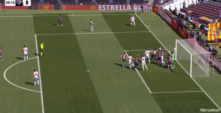 连续浪费机会的巴萨,在第24分钟利用角球的机会,由阿劳霍破门得分,在主场取得了1-0的领先,6分钟之后,拉菲尼亚再次获得机会,大禁区外的迎球怒射被客队门将扑了一下后,击中门框被弹出,半场比赛结束前,费尔明禁区内踢倒巴列卡诺进攻球员,但主裁判没有任何表示。
